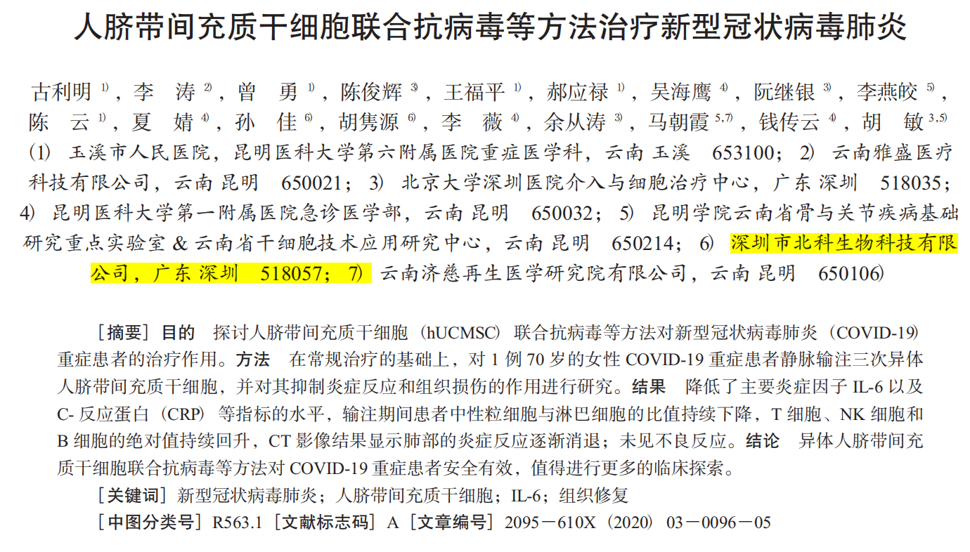 在疫情期間,北科生物也積極參與技術(shù)攻關(guān),與云南多家醫(yī)療機構(gòu)聯(lián)合開展的間充質(zhì)干細胞治療新冠肺炎危重癥患者的臨床研究也已取得階段性成果,并發(fā)表《人臍帶間充質(zhì)干細胞聯(lián)合抗病毒等方法治療新型冠狀病毒肺炎》文章。