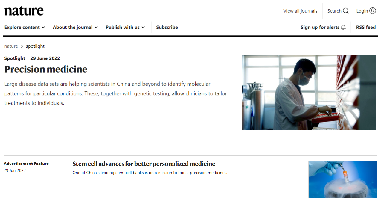 2022年6月29日,《Nature》官網(wǎng)nature spotlight增刊的“自然聚焦-中國精準(zhǔn)醫(yī)療”板塊在線發(fā)表了北科生物首席科學(xué)家蔡車國教授團隊的主題文章:干細胞進展推動更好的個性化醫(yī)療。干細胞進展推動更好的個性化醫(yī)療