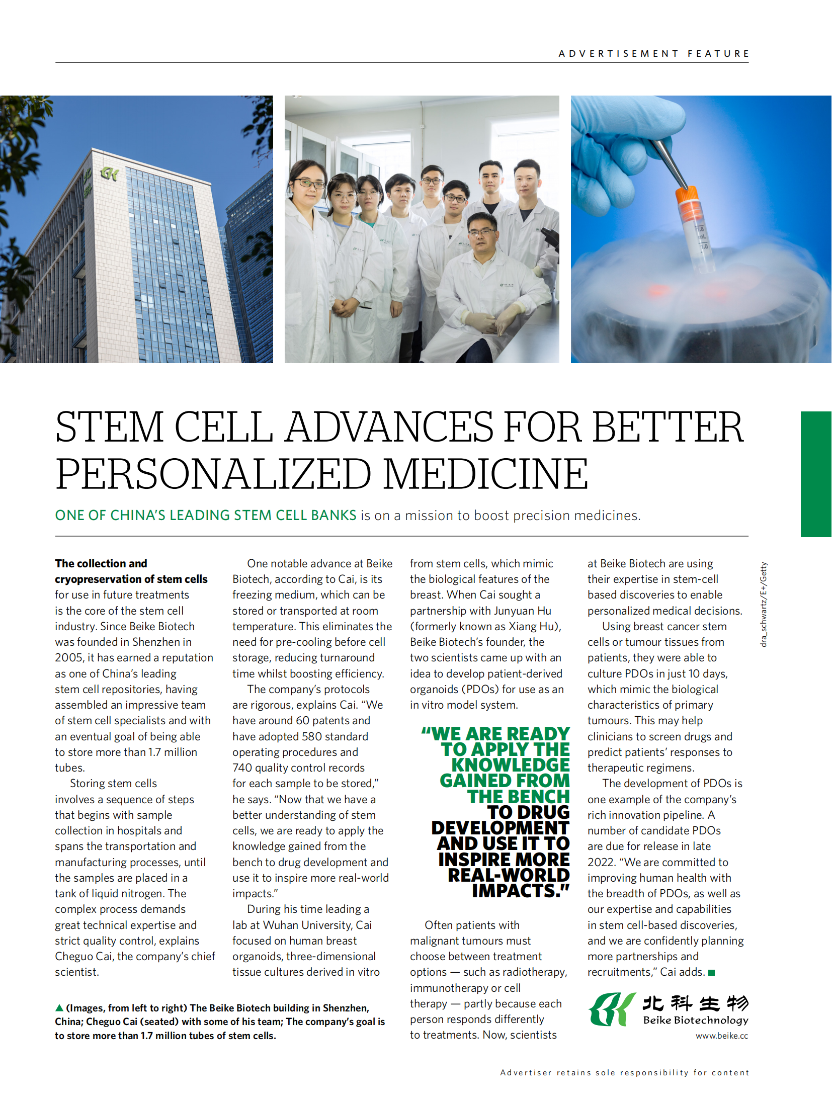 采集和凍存干細胞以用于未來的臨床治療是干細胞產(chǎn)業(yè)的核心。自2005年深圳市北科生物科技有限公司成立以來,公司已經(jīng)贏得了“中國領(lǐng)先的干細胞儲存庫”的聲譽,組建了一支優(yōu)秀且經(jīng)驗豐富的干細胞專家團隊。目前,公司在儲存業(yè)務(wù)上目標(biāo)是讓更多家庭享受先進的細胞儲存服務(wù)。儲存干細胞涉及一系列嚴格的步驟,自醫(yī)院收集樣本開始,從運輸?shù)街苽洌钡綐颖颈粌Υ嬖谝旱拗校麄€過程都要經(jīng)過嚴格的管控。該公司的首席科學(xué)家蔡車國教授表示:“這一繁雜的過程,需要大量的專業(yè)技術(shù)人員的參與和嚴格的質(zhì)量控制”。根據(jù)蔡教授介紹,“北科生物在儲存干細胞技術(shù)上的一個顯著優(yōu)勢是采用特殊的冷凍介質(zhì),它可以在室溫下儲存或運輸。這消除了細胞儲存前預(yù)冷的需要,減少了周轉(zhuǎn)時間,同時提高了效率。”“公司在儲存業(yè)務(wù)上的流程是極為嚴格的”,蔡教授解釋到,“我們有大約60項與干細胞制備、凍存相關(guān)的專利,通過約580多個標(biāo)準(zhǔn)操作程序和約740項質(zhì)量控制記錄,嚴格對待每一份儲存的干細胞樣本。而如今,我們對干細胞有了更好的了解,已經(jīng)做好充分的準(zhǔn)備將從實驗室獲得的知識及技術(shù)應(yīng)用于干細胞藥物的開發(fā),并利用它來激發(fā)對現(xiàn)實世界更多的影響?!?/section>蔡教授在武漢大學(xué)的實驗室研究團隊則專注于乳腺類器官的研究,即在體外利用干細胞培養(yǎng)技術(shù)獲得3D結(jié)構(gòu)的培養(yǎng)物,該培養(yǎng)物呈現(xiàn)了乳腺的基因表達特點和形態(tài)結(jié)構(gòu)特征。當(dāng)深圳市北科生物科技有限公司的創(chuàng)始人胡雋源博士尋求與蔡教授合作時,這兩位科學(xué)家提出了一個合作想法,即開發(fā)病人來源的類器官模型(Patient Derived Organoid,PDO)作為體外疾病模型系統(tǒng)使用。惡性腫瘤患者在臨床治療時往往面臨選擇治療藥物和治療方案的困難,造成這種現(xiàn)象的部分原因是由于每個人對治療的反應(yīng)程度不同,醫(yī)生需要邊治療邊調(diào)整?,F(xiàn)在,深圳市北科生物科技有限公司的科學(xué)家團隊,正在開發(fā)利用基于PDO模型的體外試藥系統(tǒng),有望未來為患者提供個性化、精準(zhǔn)的治療方案。“PDO模型的技術(shù)開發(fā)是北科生物豐富的科技創(chuàng)新管線中的一個例子。一些候選的疾病PDO模型將于2022年底發(fā)布?!?/span>蔡教授補充說:“我們通過構(gòu)建多種疾病和多種組織的PDO模型,以及在干細胞方面的研究發(fā)現(xiàn)和技術(shù)能力的積累來改善人類健康,我們歡迎更多志同道合的合作伙伴加入到這個行業(yè),共同為人類健康服務(wù)。”增刊系列報道:https://www.nature.com/collections/dbafabjahe