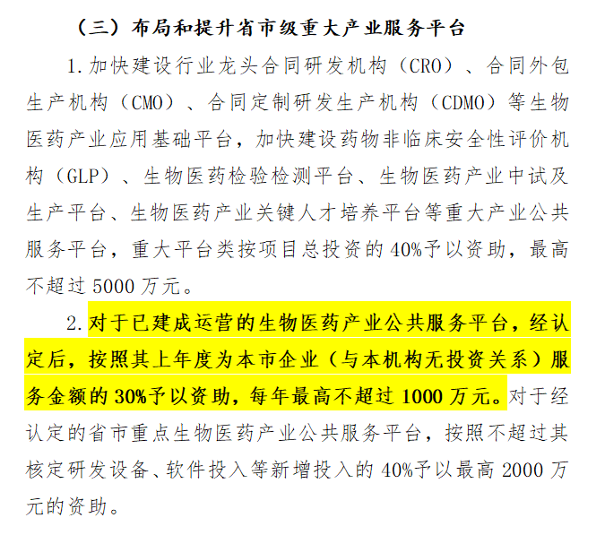 對于已建成的運營的生物醫(yī)藥產(chǎn)業(yè)公共服務(wù)平臺,予以資金支持。