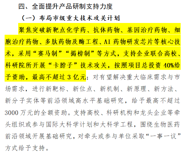 聚焦突破新靶點化學(xué)藥、抗體藥物、基因治療藥物、細(xì)胞治療藥物、多肽藥物及酶工程、AI藥物研發(fā)芯片等核心技術(shù),采用“賽馬制”“揭榜制”等方式,支持企業(yè)聯(lián)合高校、科研院所開展“卡脖子”技術(shù)攻關(guān),按照項目總投資40%給予資助,最高不超過3億元。